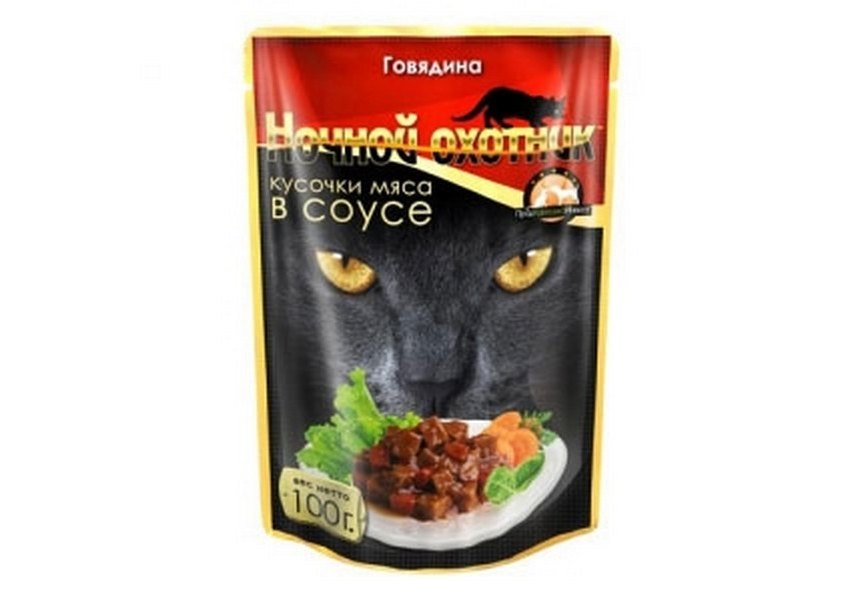 Ночной охотник Влажный корм Паучи для кошек Говядина кусочки в соусе (цена за упаковку) 100г х 24шт