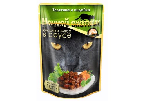 Ночной охотник Влажный корм Паучи для кошек Телятина Индейка кусочки в соусе (цена за упаковку) 100г х 24шт