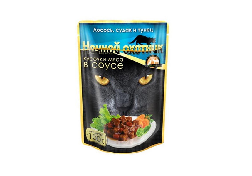 Ночной охотник Влажный корм Паучи для кошек Лосось Судак Тунец кусочки в соусе (цена за упаковку) 100г х 24шт