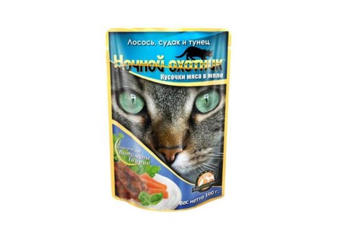 Ночной охотник Влажный корм Паучи для кошек Лосось Судак Тунец кусочки в желе (цена за упаковку) 100г х 24шт