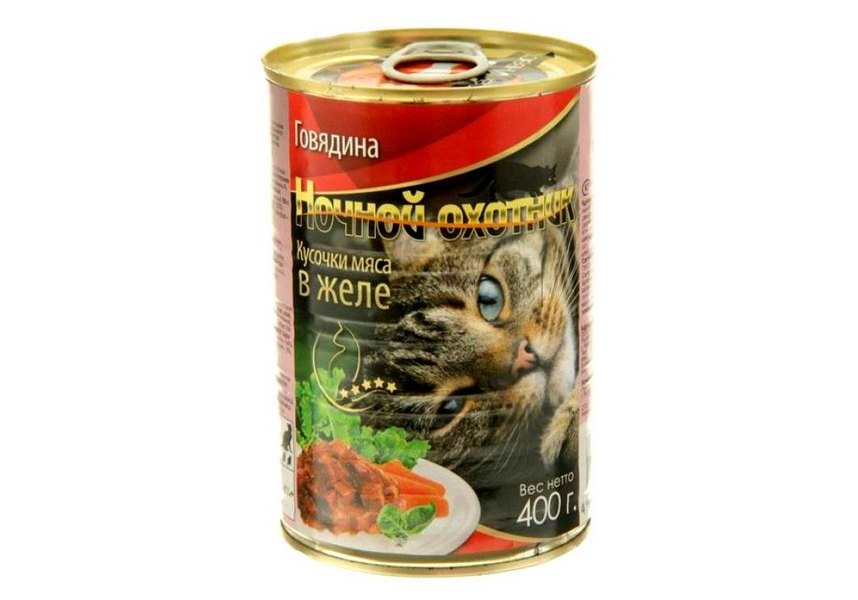 Ночной охотник Влажный корм Консервы для кошек Говядина кусочки в желе (цена за упаковку) 415г х 20шт
