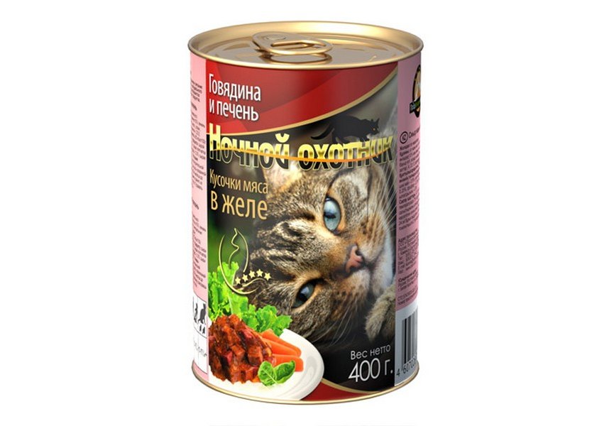 Ночной охотник Влажный корм Консервы для кошек Говядина Печень кусочки в желе (цена за упаковку) 415г х 20шт