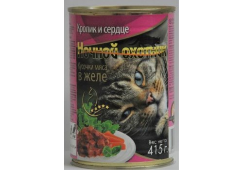 Ночной охотник Влажный корм Консервы для кошек Кролик Сердце кусочки в желе (цена за упаковку) 415г х 20шт