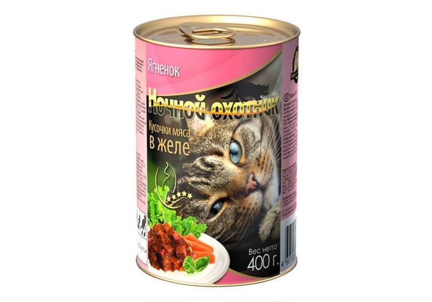 Ночной охотник Влажный корм Консервы для кошек Ягненок кусочки в желе (цена за упаковку) 415г х 20шт