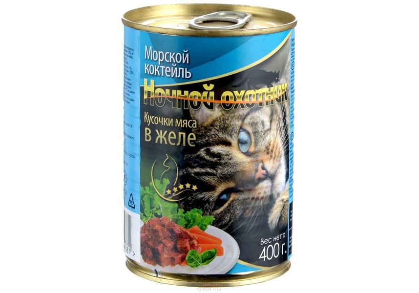 Ночной охотник Влажный корм Консервы для кошек Морской коктейль кусочки в желе (цена за упаковку) 415г х 20шт