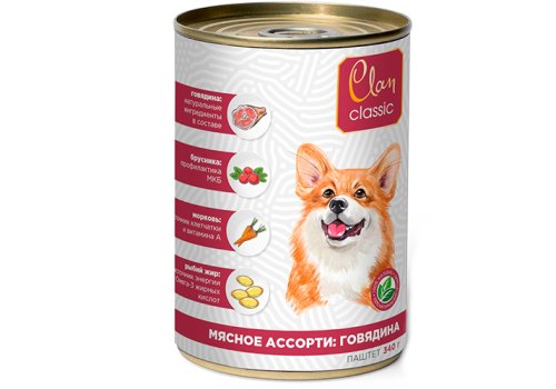 Clan Classic Консервы Клан для собак Мясное ассорти с Говядиной (цена за упаковку) 340г х 12шт