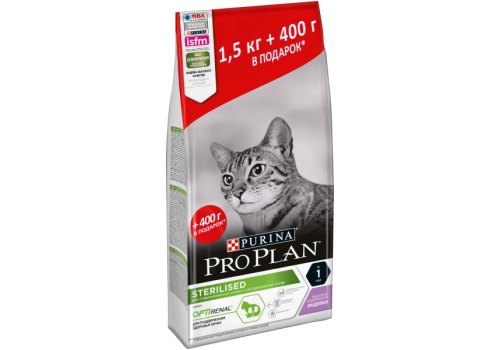 PRO PLAN STERILISED Сухой корм ПРО ПЛАН для взрослых кошек для поддержания здоровья почек после стерилизации с индейкой 1,5 кг + 400 г