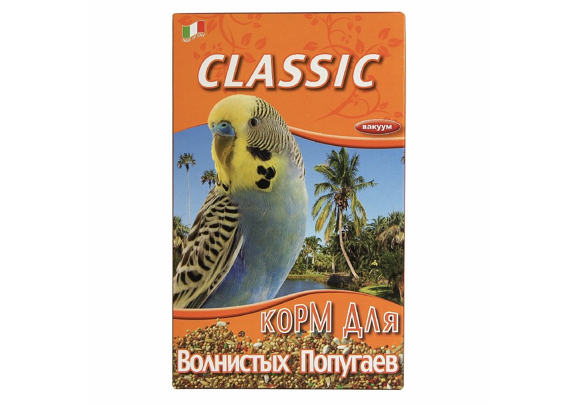 Классическая смесь для волнистых попугаев. В состав входит желтое просо, красное просо, овес лущеный, белое просо, лён, сафлор канареечный, семена канареечника, пекарные продукты. Корм упакован в вакуум.