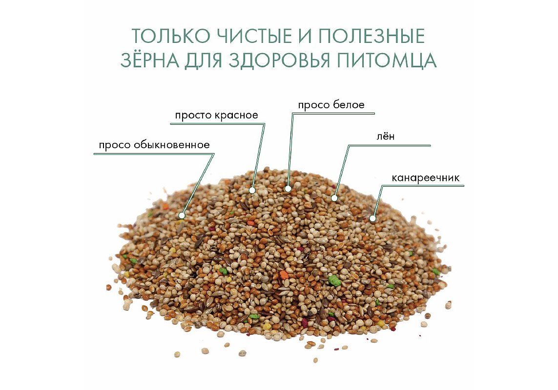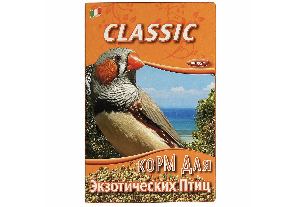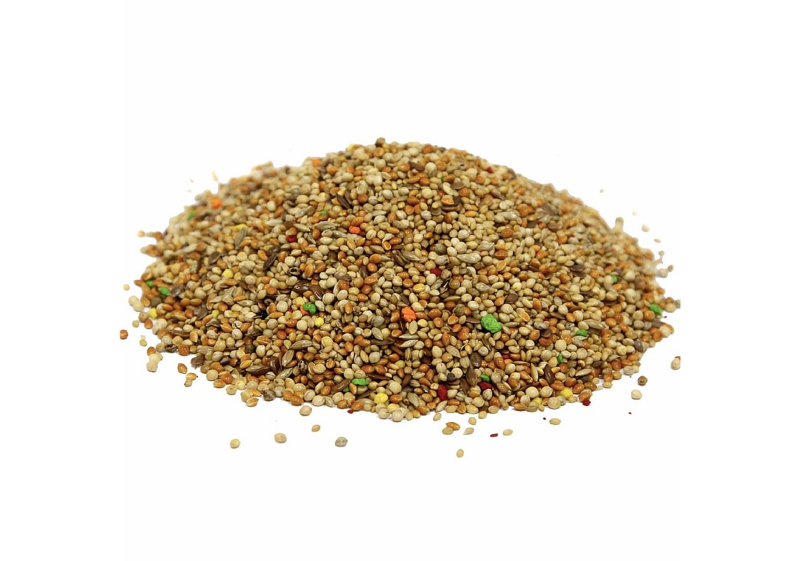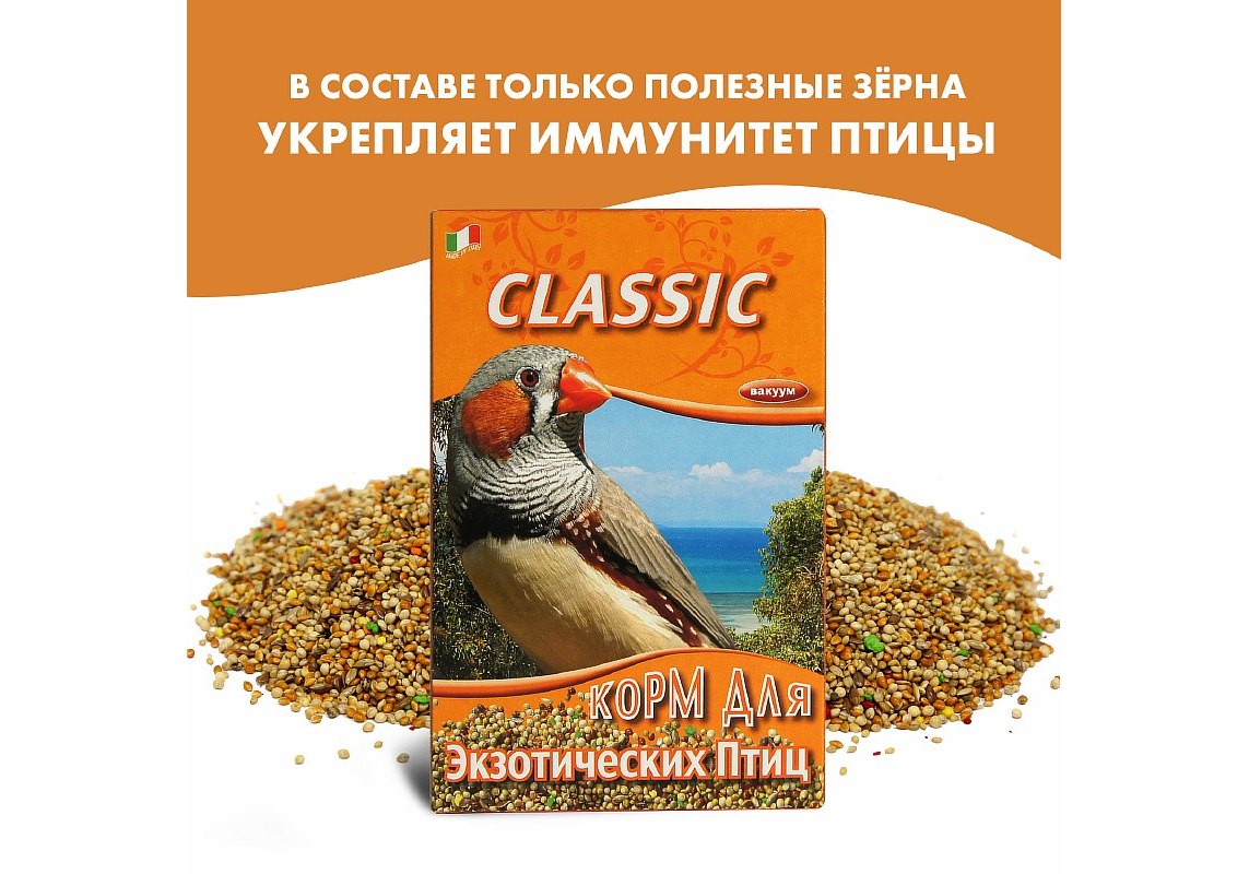 Классическая смесь для экзотических птиц. В состав входит красное, белое, желтое просо, двукисточник тростниковый, лен, пекарные продукты. Корм упакован в вакуум.
