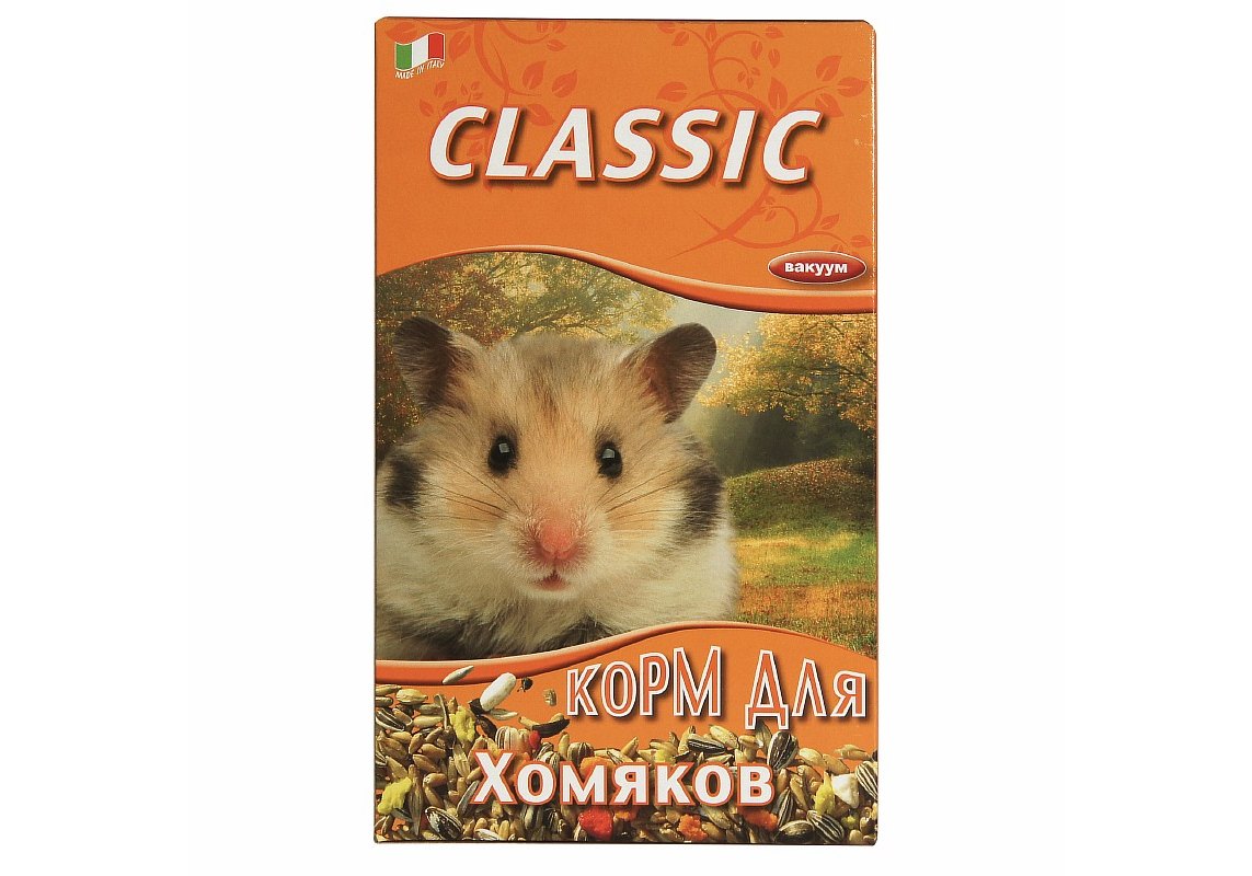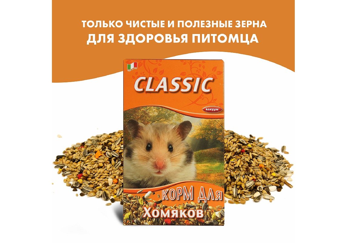 Классическая смесь для хомяков. В состав входят злаки и зерновые продукты, семена масличных культур и маслосодержащих плодов и фруктов, гречиха, пекарные продукты. Корм упакован в вакуум.