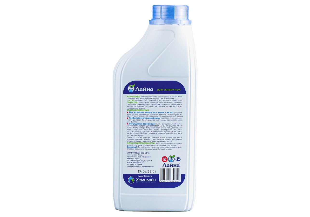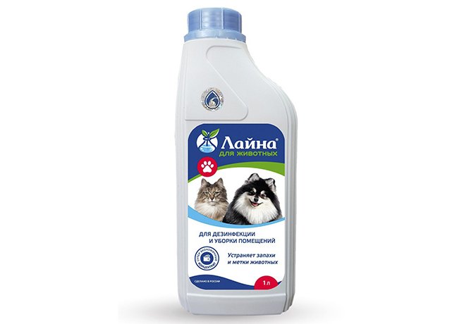 Лайна для животных является профессиональным дезинфицирующим средством, предназначенным для дезинфекции и уборки помещений, где содержатся домашние животные. Лайна обладает широким спектром антимикробного действия в отношении возбудителей инфекционных болезней бактериальной, вирусной и грибковой этиологии, отличными моющими и дезодорирующими свойствами, при проведении генеральных уборок удаляет метки животных и жировые загрязнения, устраняет неприятные запахи. Дезинфекция может быть совмещена с мойкой и дезодорацией в одном процессе.