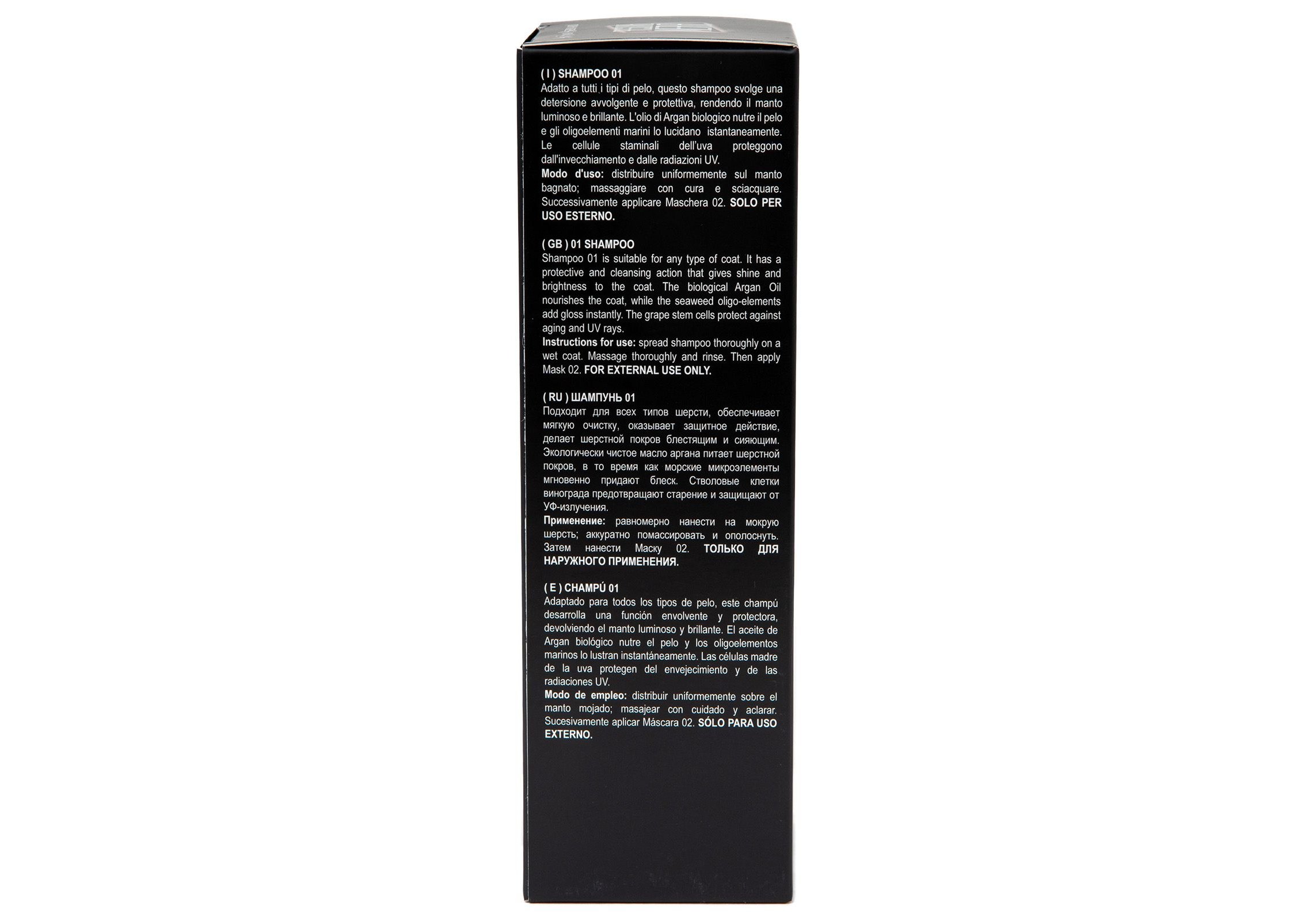 Подходит для всех типов шерсти, обеспечивает мягкую очистку, оказывает защитное действие, делает шерстной покров блестящим и сияющим. Экологически чистое масло аргана питает шерстной покров, в то время как морские микроэлементы мгновенно придают блеск. Стволовые клетки винограда предотвращают старение и защищают от УФ-излучения.