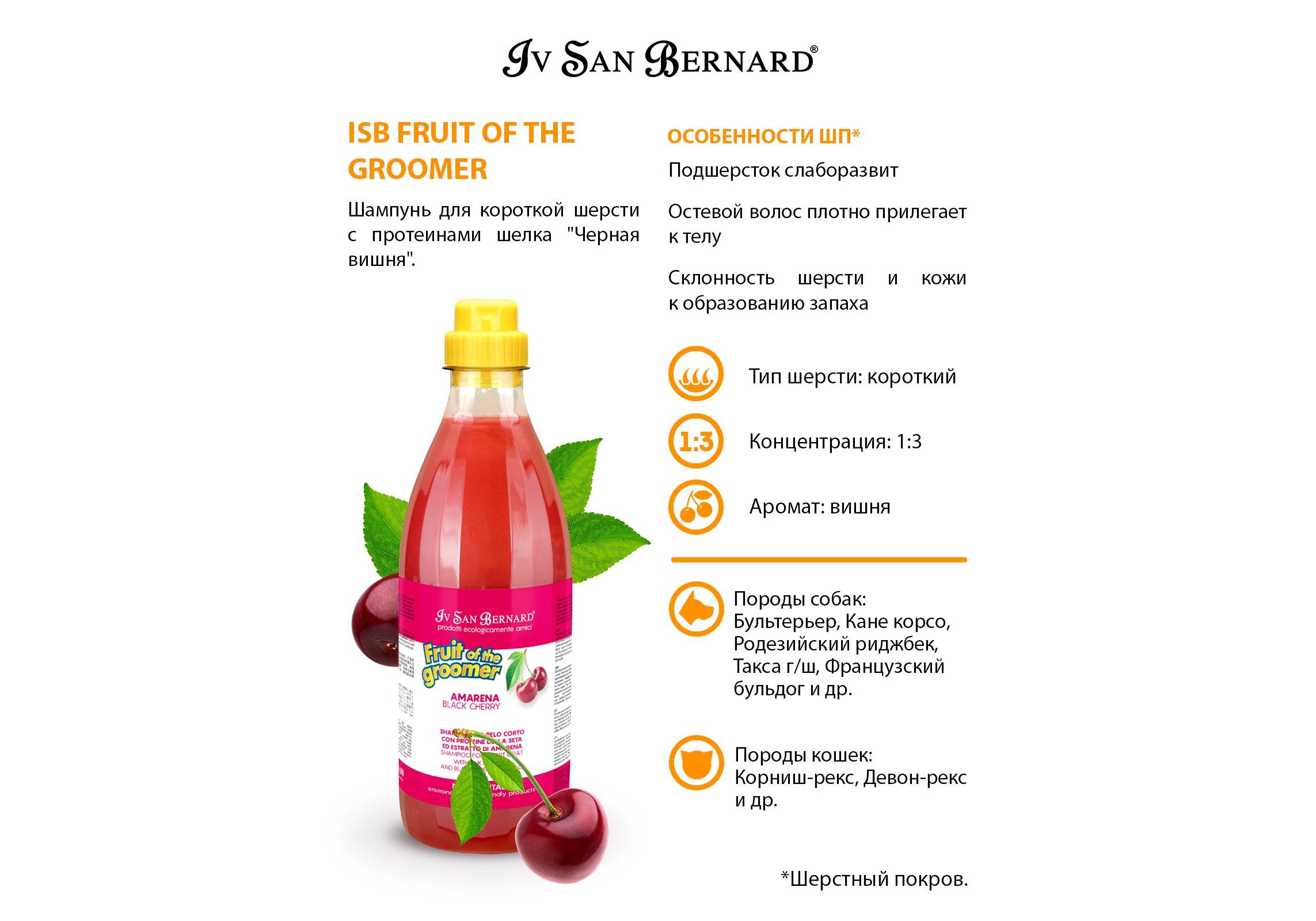 Iv San Bernard Fruit of the Groomer Black Cherry Shampoo Short coat Шампунь Ив Сан Бернард для Короткой шерсти с Протеинами шелка 1 л