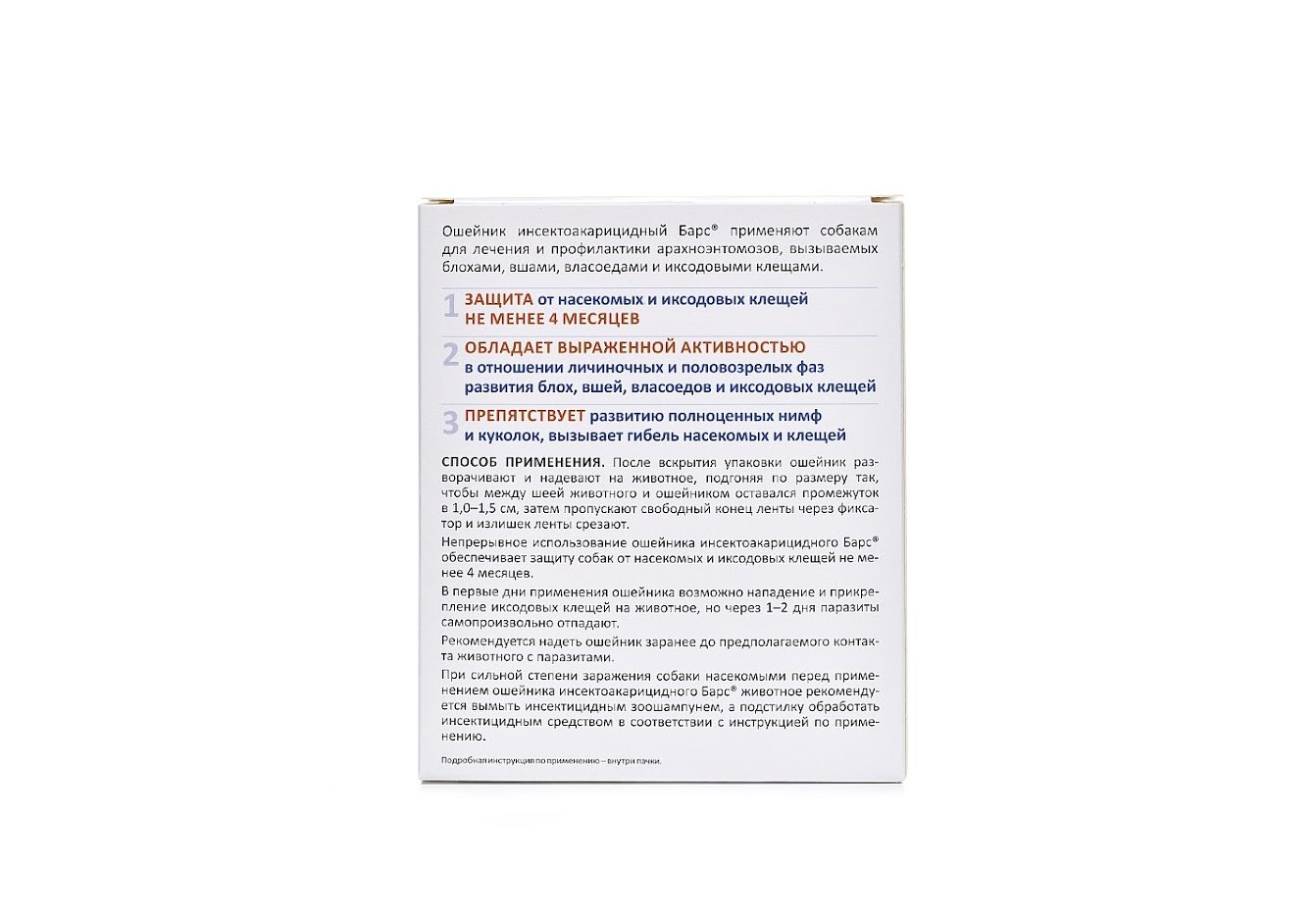 После вскрытия упаковки ошейник «Барс» от клещей и блох разворачивают и надевают на животное, подгоняя по размеру так, чтобы между шеей животного и ошейником оставался промежуток в 1,0–1,5 см, затем пропускают свободный конец ленты через фиксатор и излишек ошейника срезают.
