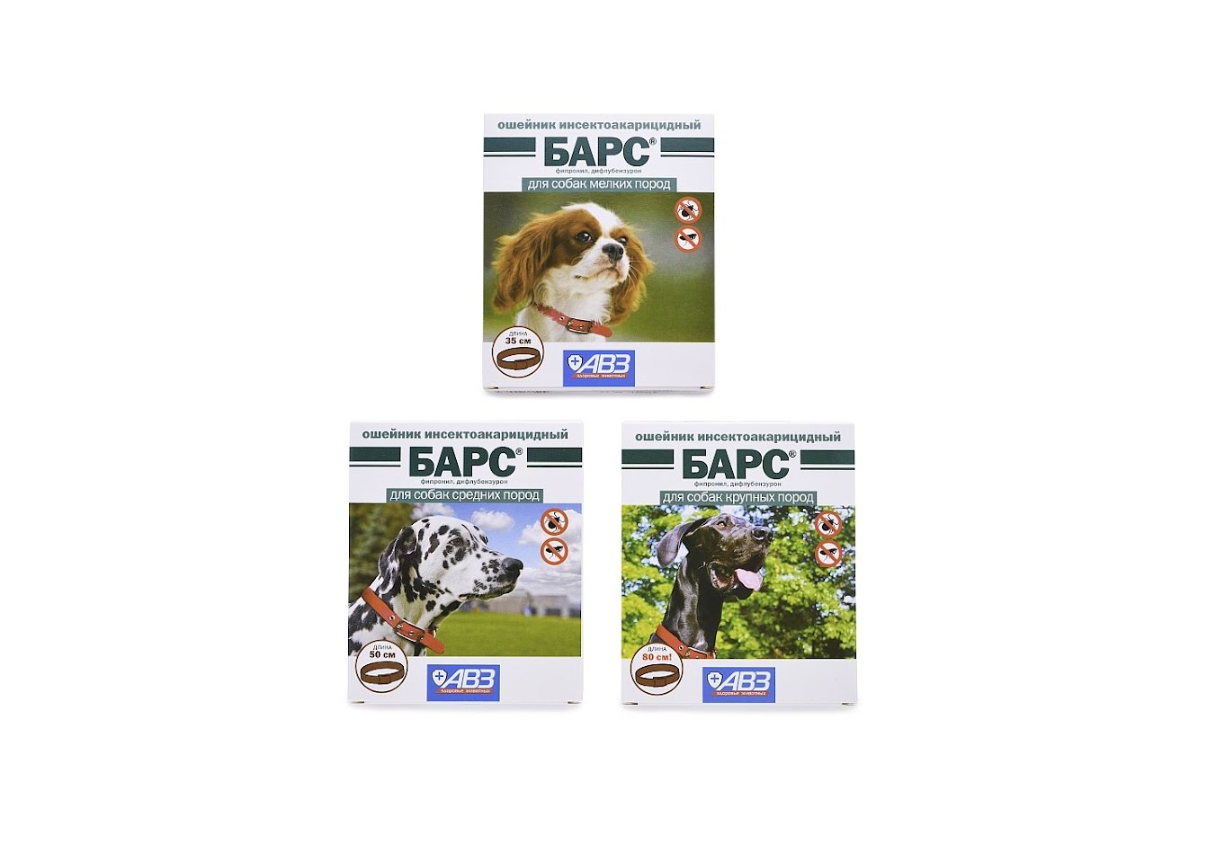 Среди препаратов АВЗ особой популярностью пользуются различные средства от блох и клещей. Разные дозировки препарата рассчитаны на разный вес животных. Средства эффективны и безопасны.