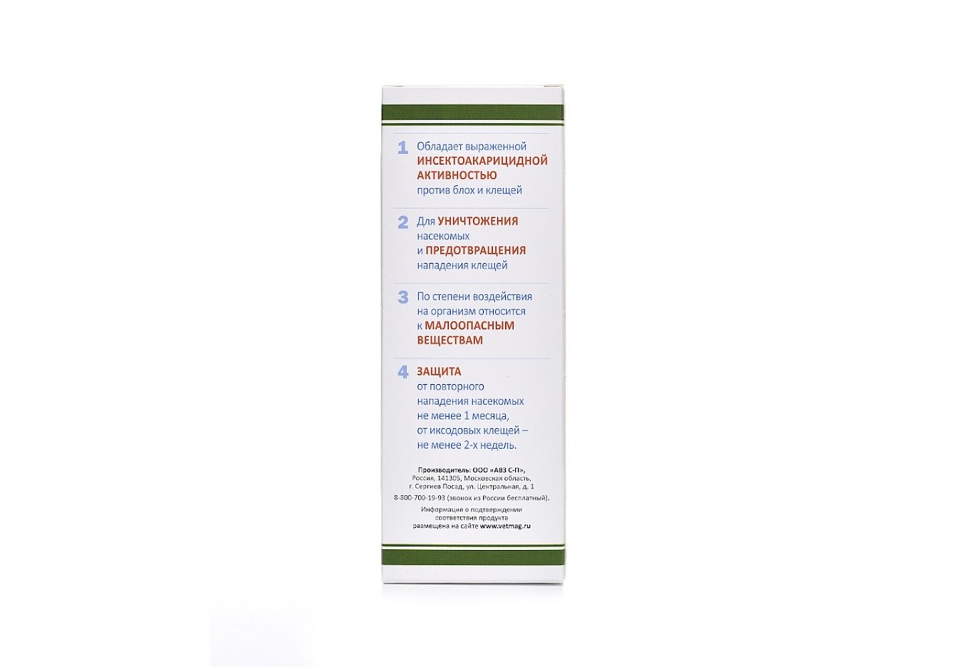 -Защита от насекомых 1 месяц, от клещей 2 недели.