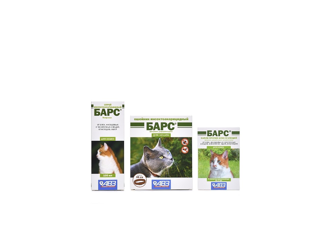 Среди препаратов АВЗ особой популярностью пользуются различные средства от блох и клещей. Разные дозировки препарата рассчитаны на разный вес животных. Средства эффективны и безопасны.