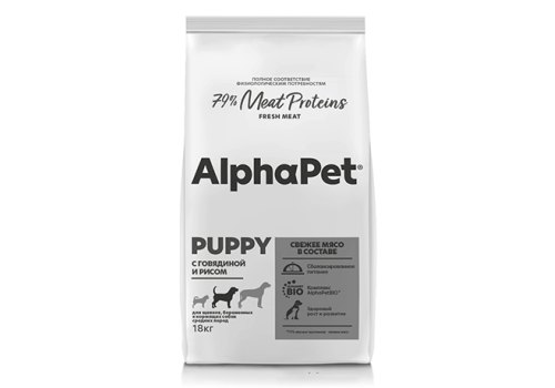 AlphaPet Puppy Superpremium Сухой корм АльфаПет для Щенков, беременных и кормящих собак Средних пород Говядина рис 18 кг