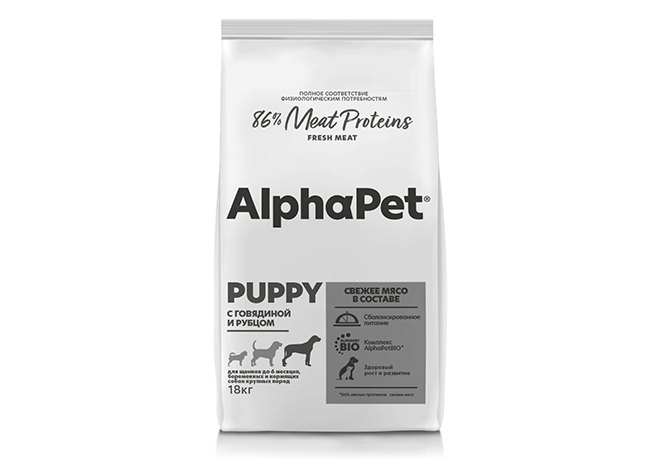 AlphaPet Puppy Superpremium Сухой корм АльфаПет для Щенков, беременных и кормящих собак Крупных пород до 6 месяцев Говядина рубец 18 кг