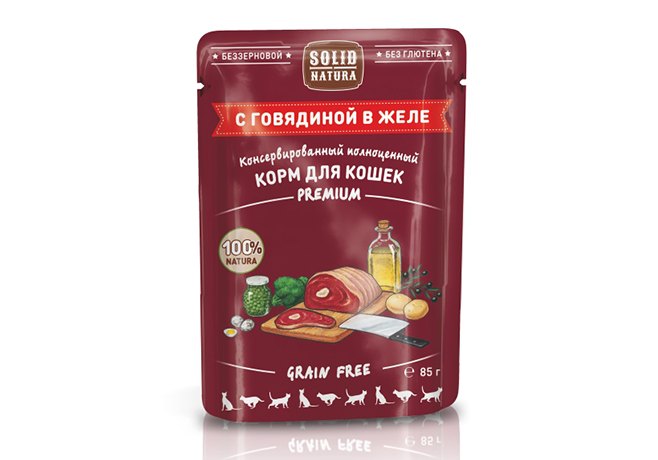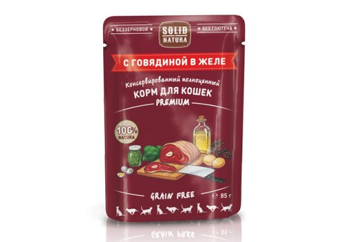 Solid Natura Premium Паучи Солид Натура Беззерновые для кошек Кусочки в желе с Говядиной (цена за упаковку) 85г х 14шт