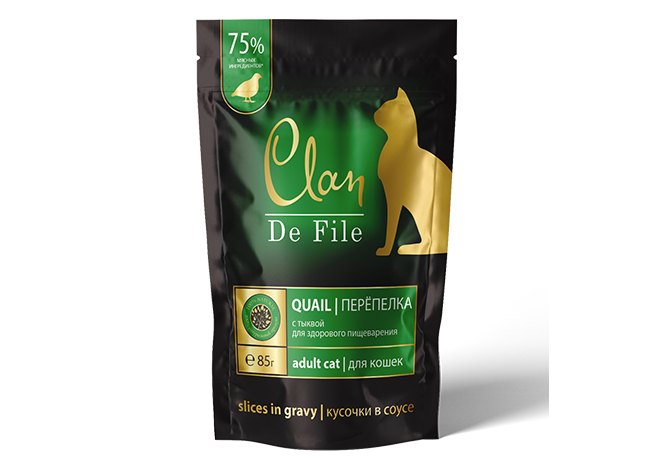 Clan De File Паучи Клан для взрослых кошек Кусочки в соусе Перепелка с тыквой (цена за упаковку) 85г х 14шт