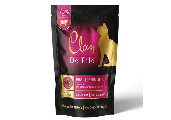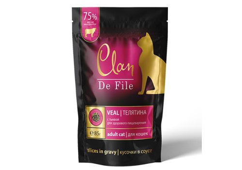 Clan De File Паучи Клан для взрослых кошек Кусочки в соусе Телятина с тыквой (цена за упаковку) 85г х 14шт