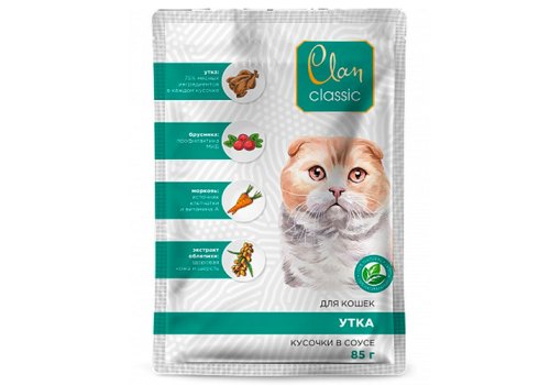 Clan Classic Паучи Клан для кошек Кусочки в соусе Утка, брусника, морковь (цена за упаковку) 85г х 14шт