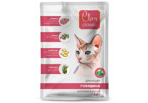 Clan Classic Паучи Клан для кошек Кусочки в соусе Говядина, клюква, спирулина (цена за упаковку) 85г х 14шт
