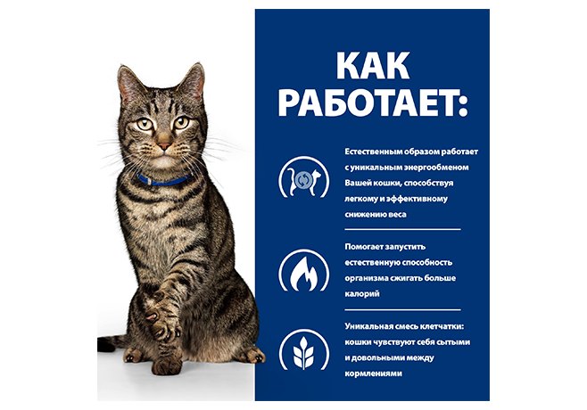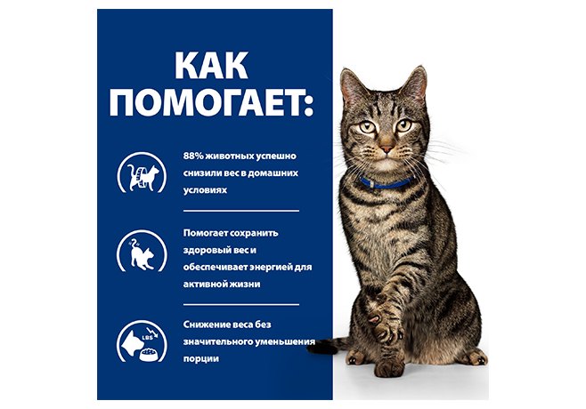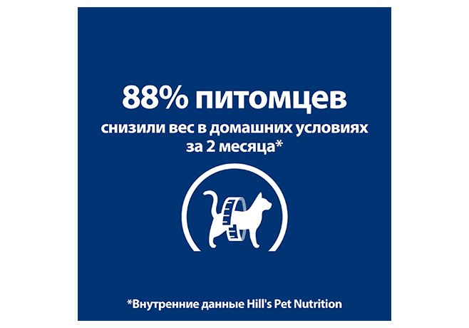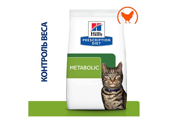 Даже небольшой лишний вес влияет на качество жизни кошки: ухудшается общее состояние здоровья, остаётся меньше сил на игры, кошка становится менее подвижной, увеличивается риск заболеваний, связанных с избыточным весом. Диетологи и ветеринарные специалисты Hill's разработали Prescription Diet Metabolic - сухой диетический корм, созданный для лёгкого снижения и контроля веса с учётом уникальных потребностей кошек. Этот корм помогает вашей кошке сжигать жир и дает энергию для активных игр. С уникальной смесью клетчатки кошка всегда сыта и довольна между кормлениями. 88% кошек успешно снизили вес в домашних условиях за 2 месяца с Hill's Prescription Diet Metabolic.