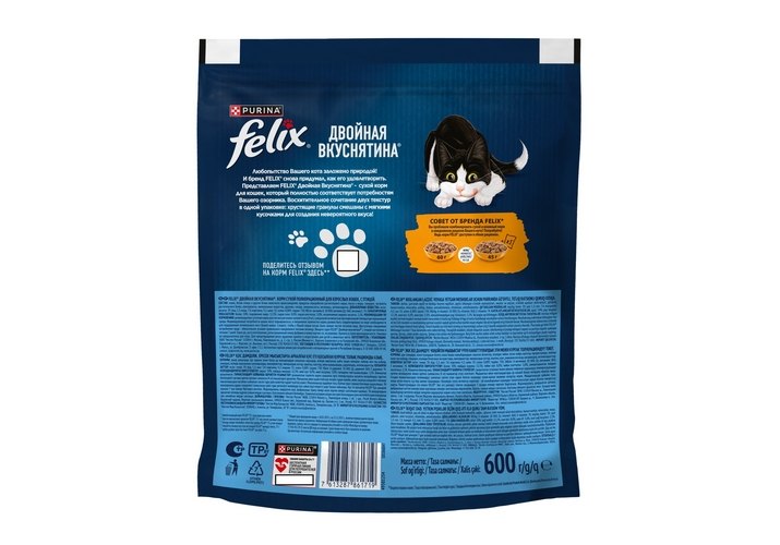 FELIX ДВОЙНАЯ ВКУСНЯТИНА Сухой корм Пурина Феликс для взрослых кошек с птицей 600 г