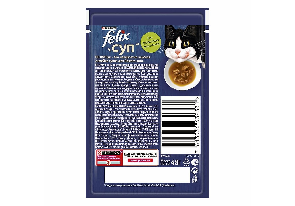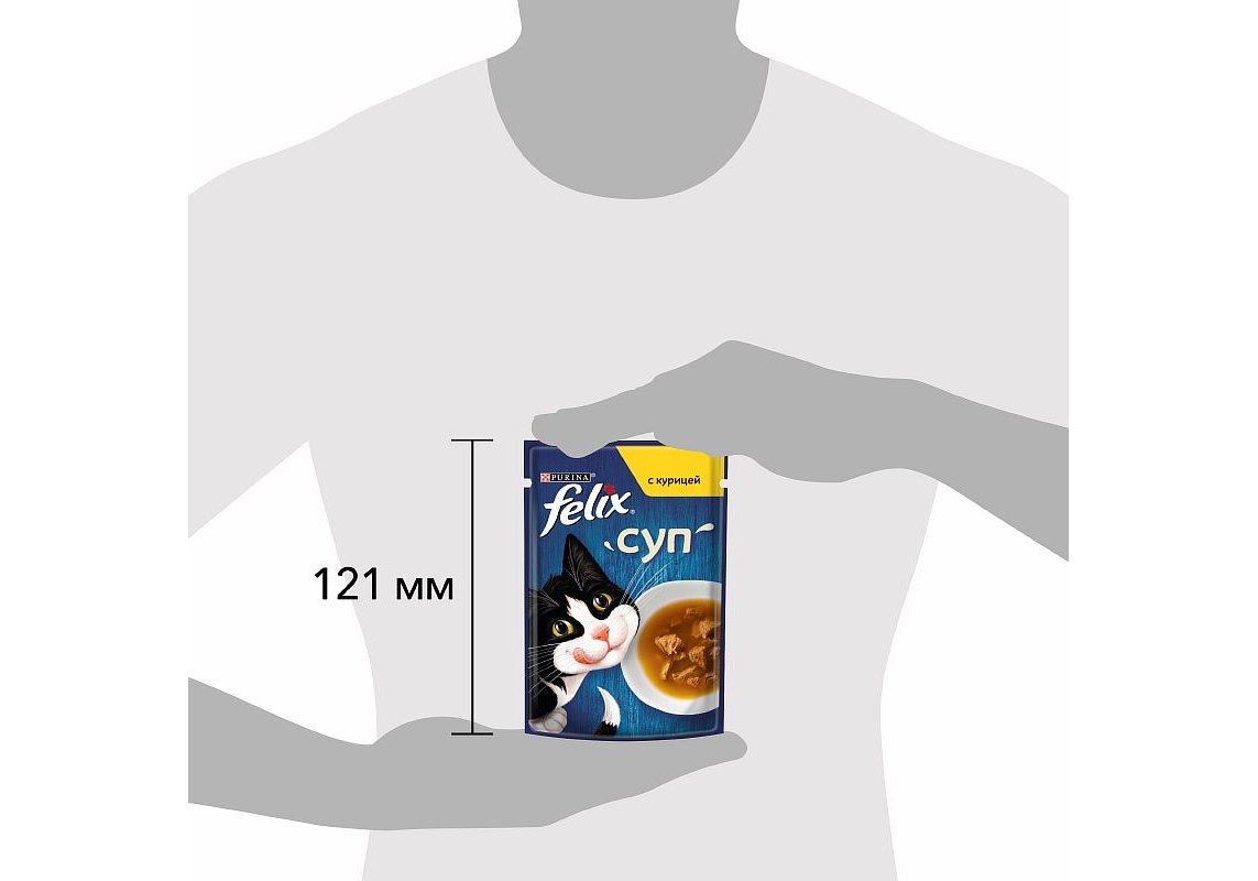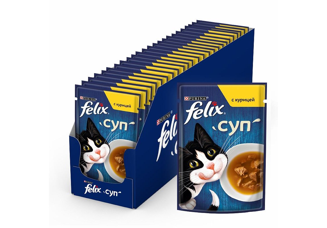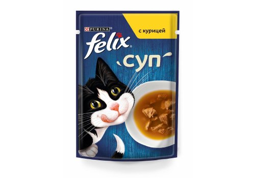 Влажный корм Felix Суп для взрослых кошек, с курицей, пауч. Эксперты Purina, разрабатывая влажные корма для домашних питомцев, создали не просто корм для взрослых кошек, а Felix Суп — настоящую вкуснятину «на первое» и идеальное дополнение к рациону Вашего любимца. Влажный корм с вкуснейшим соусом и крупными кусочками мяса станет любимейшим первым блюдом, с которого можно начинать полноценный обед.