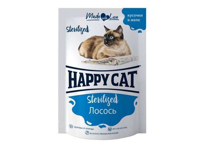 Happy Cat Sterilized Паучи Хэппи Кэт для Стерилизованных кошек Лосось кусочки в желе (цена за упаковку, Россия) 100г х 24шт