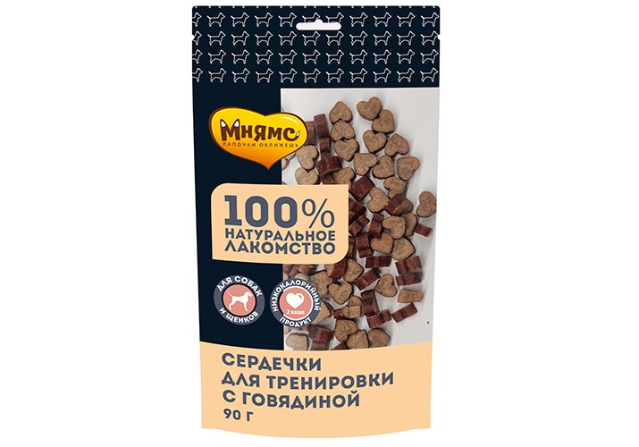 Мнямс тренировочные лакомства «Сердечки» с говядиной для взрослых собак и щенков старше 3-х месяцев предназначены для поощрения питомца во время прогулки и дрессировки. Благодаря высокой вкусовой привлекательности, низкой калорийности и оптимальному размеру каждого лакомства идеальны для собак любых пород. Не пачкают руки и не крошатся, подходят для использования в интерактивных игрушках.