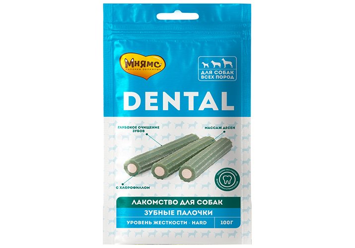 Мнямс DENTAL "Зубные палочки" с хлорофиллом – вкусное и полезное лакомство для взрослых собак и щенков старше 3-х месяцев. Обладают высокой вкусовой привлекательностью, предотвращают появление зубного налета, обеспечивают деликатный массаж десен. Благодаря хлорофиллу в составе, способствуют снижению кровоточивости десен, дезодорирует полость рта и освежают дыхание.