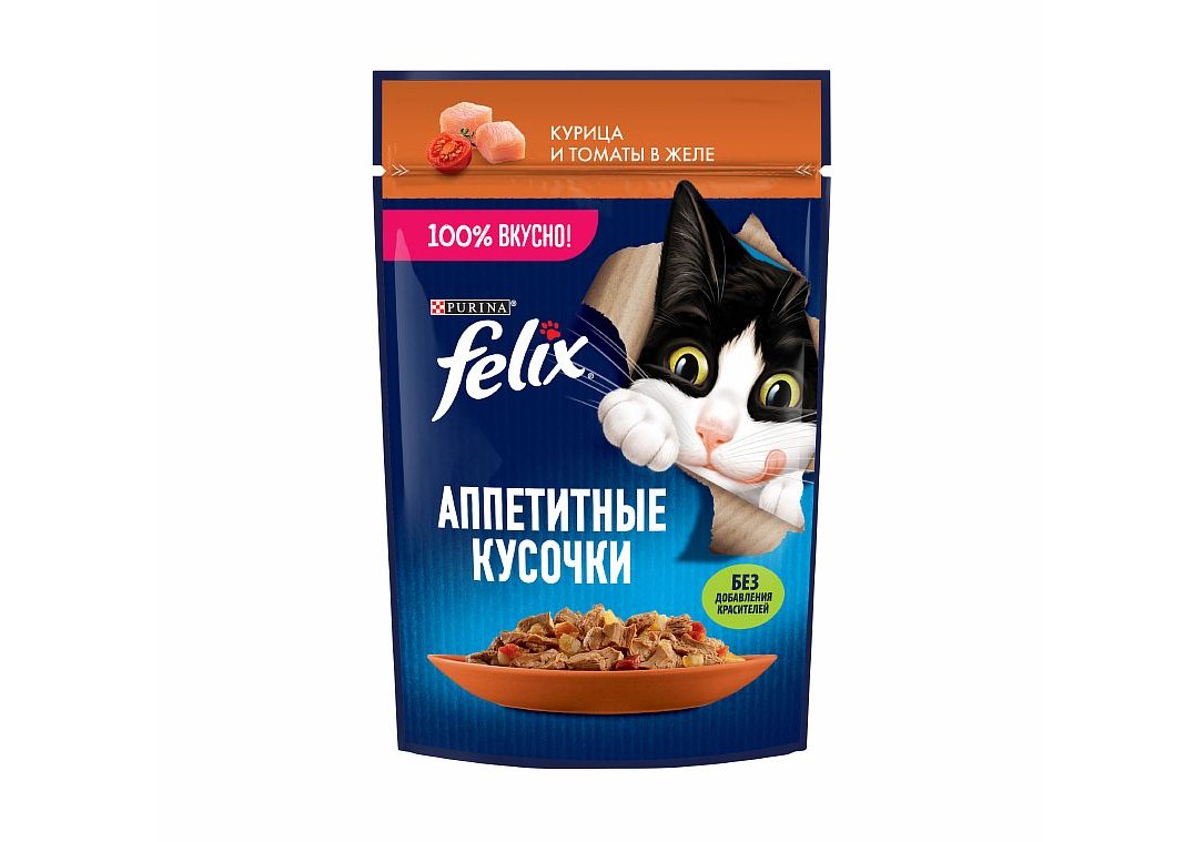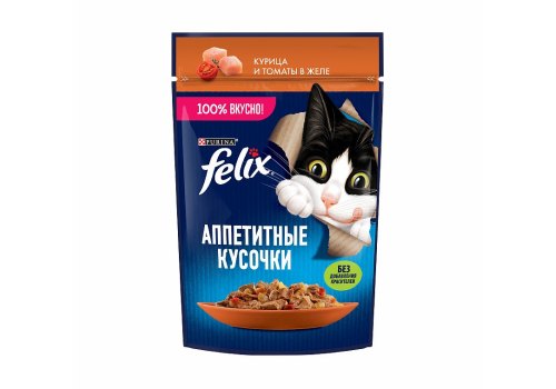 Влажный корм Felix Аппетитные кусочки для взрослых кошек, с курицей и томатами в желе 75 г. Каждый котик желает наслаждаться совершенно особенным кормом, у которого будет такой аппетитный вид и аромат, словно Вы приготовили его сами. Каждый пакетик корма для взрослых кошек «Аппетитные кусочки» содержит нежные кусочки в сочном желе – вкуснятину, от которой кота за уши не оттащишь! Эксперты Purina, разрабатывая влажные корма для домашних любимцев, создали корм для взрослых кошек Felix «Аппетитные кусочки» — специально для Вашего любителя вкуснятины. Влажный корм для кошек Felix Аппетитные кусочки — полнорационный, содержит все необходимое для здоровой активной долгой жизни.
