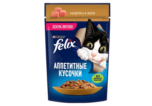 Влажный корм Felix Аппетитные кусочки для взрослых кошек, с индейкой в желе 75 г. Каждый котик желает наслаждаться совершенно особенным кормом, у которого будет такой аппетитный вид и аромат, словно Вы приготовили его сами. Каждый пакетик корма для взрослых кошек «Аппетитные кусочки» содержит нежные кусочки в сочном желе – вкуснятину, от которой кота за уши не оттащишь! Эксперты Purina, разрабатывая влажные корма для домашних любимцев, создали корм для взрослых кошек Felix «Аппетитные кусочки» — специально для Вашего любителя вкуснятины.
