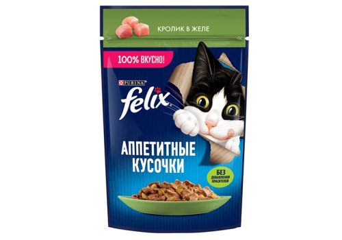 Влажный корм Felix Аппетитные кусочки для взрослых кошек, с кроликом в желе 75 г. Каждый котик желает наслаждаться совершенно особенным кормом, у которого будет такой аппетитный вид и аромат, словно Вы приготовили его сами. Каждый пакетик корма для взрослых кошек «Аппетитные кусочки» содержит нежные кусочки в сочном желе – вкуснятину, от которой кота за уши не оттащишь! Эксперты Purina, разрабатывая влажные корма для домашних любимцев, создали корм для взрослых кошек Felix «Аппетитные кусочки» — специально для Вашего любителя вкуснятины.