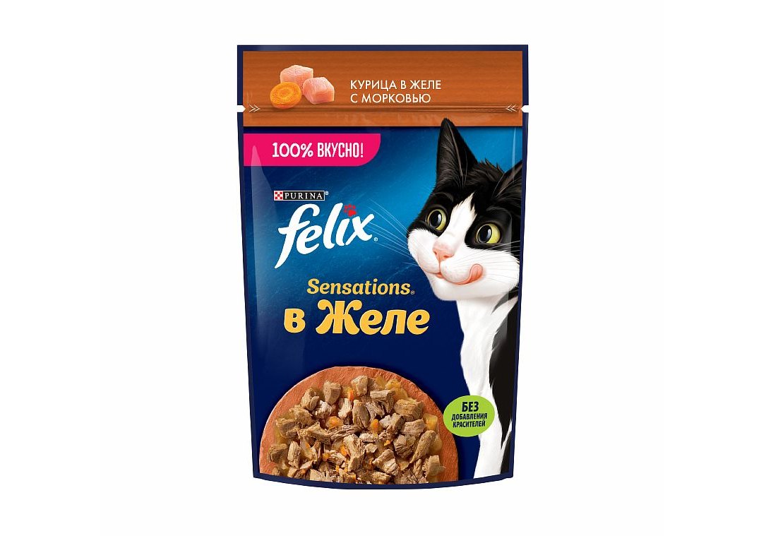Влажный корм Felix Sensations для взрослых кошек, с курицей в желе с морковью 75 г. Чтобы Ваш питомец получил богатейшую палитру ощущений вкуса и аромата, эксперты Purina создали влажный корм для взрослых кошек Felix «Sensations». Влажные корма для кошек Felix, созданные из высококачественных ингредиентов с заботливо приготовленными нежными кусочками в аппетитном желе подарят Вашему любимцу потрясающие ощущения и оптимальную комбинацию питательных веществ для активной и здоровой жизни.