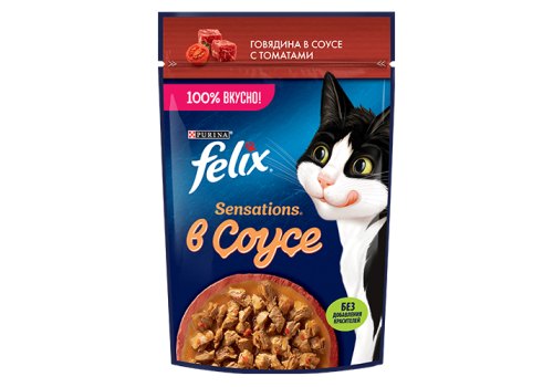 Влажный корм Felix Sensations для взрослых кошек, с говядиной в соусе с томатами 75 г. Чтобы Ваш питомец получил богатейшую палитру ощущений вкуса и аромата, эксперты Purina создали влажный корм для взрослых кошек Felix «Sensations». Влажные корма для кошек Felix, созданные из высококачественных ингредиентов с заботливо приготовленными нежными кусочками в аппетитном соусе подарят Вашему любимцу потрясающие ощущения и оптимальную комбинацию питательных веществ для активной и здоровой жизни.