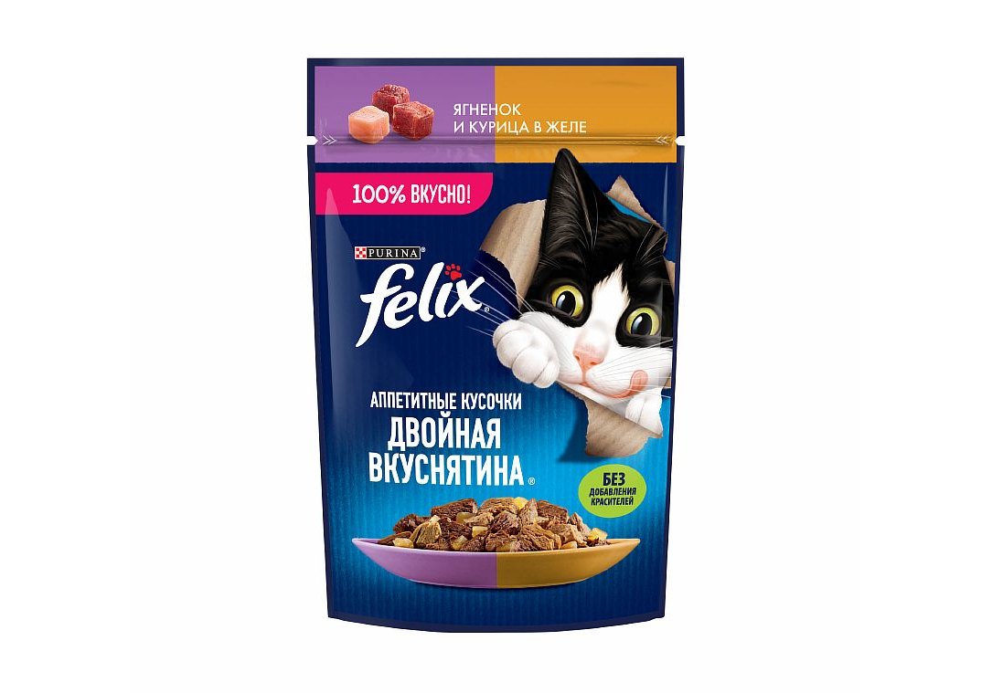 Влажный корм Felix Аппетитные кусочки, Двойная Вкуснятина для взрослых кошек, с ягненком и курицей, в желе 75 г. Лучше вкуснятины может быть только Двойная вкуснятина: сочетание двух аппетитнейших вкусов, перед которыми невозможно устоять. Эксперты Purina создали Felix Аппетитные кусочки Двойная Вкуснятина - невероятно вкусный влажный корм для взрослых кошек, сочетающий в себе сочные кусочки двух разных вкусов в аппетитном желе. Влажные корма Felix Аппетитные кусочки Двойная вкуснятина — полнорационные, и не только содержит все необходимые для здоровья вашего любимца, но и имеет такой аппетитный вид и аромат, словно Вы приготовили его сами. Теперь Ваша кошка может наслаждаться двумя любимыми вкусами сразу!