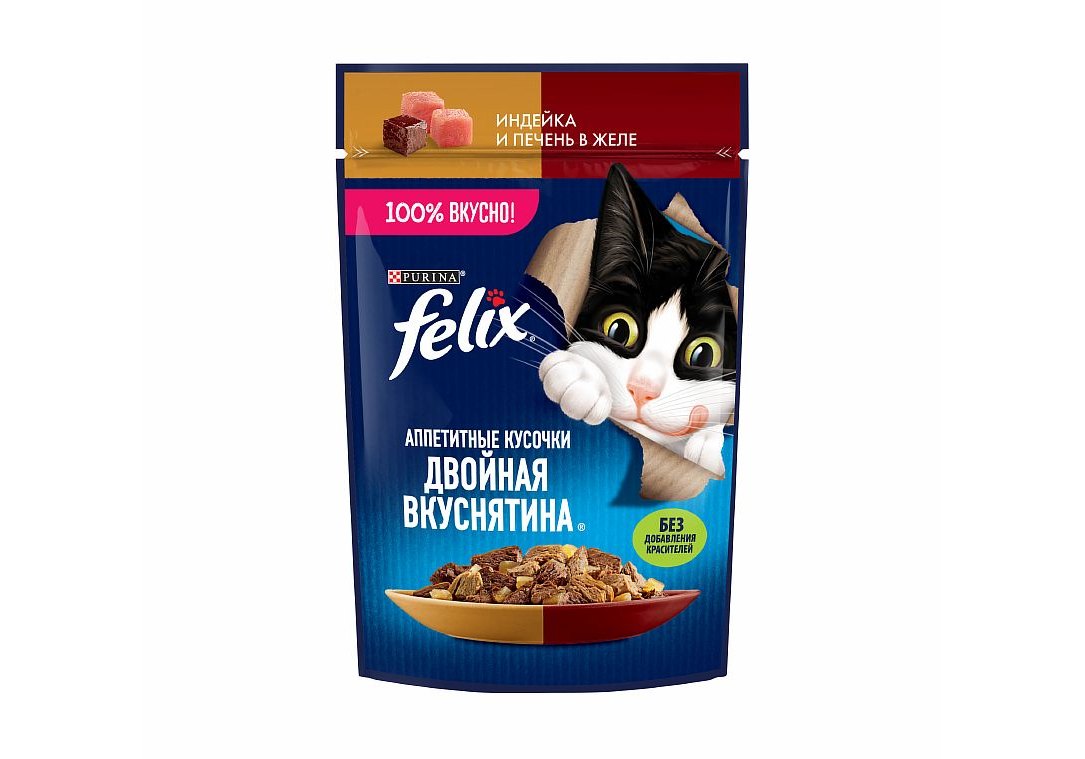 Влажный корм Felix Аппетитные кусочки, Двойная Вкуснятина для взрослых кошек, с индейкой и печенью, в желе 75 г. Лучше вкуснятины может быть только Двойная вкуснятина: сочетание двух аппетитнейших вкусов, перед которыми невозможно устоять. Эксперты Purina создали Felix Аппетитные кусочки Двойная Вкуснятина - невероятно вкусный влажный корм для взрослых кошек, сочетающий в себе сочные кусочки двух разных вкусов в аппетитном желе. Влажные корма Felix Аппетитные кусочки Двойная вкуснятина — полнорационные, и не только содержит все необходимые для здоровья вашего любимца, но и имеет такой аппетитный вид и аромат, словно Вы приготовили его сами. Теперь Ваша кошка может наслаждаться двумя любимыми вкусами сразу!