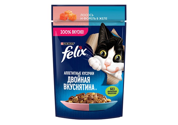 Влажный корм Felix Аппетитные кусочки, Двойная вкуснятина для взрослых кошек, с лососем и форелью в желе 75 г. Лучше вкуснятины может быть только Двойная вкуснятина: сочетание двух аппетитнейших вкусов, перед которыми невозможно устоять. Эксперты Purina создали Felix Аппетитные кусочки Двойная Вкуснятина - невероятно вкусный влажный корм для взрослых кошек, сочетающий в себе сочные кусочки двух разных вкусов в аппетитном желе.
