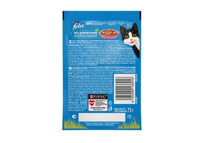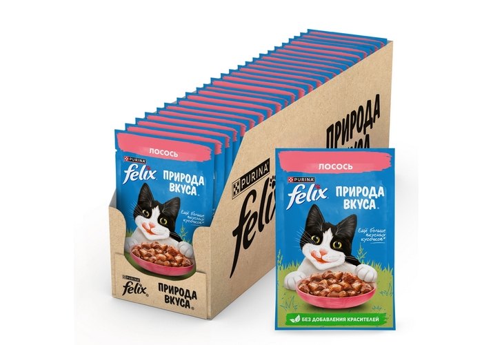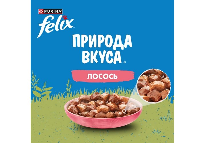 Влажный корм Felix Природа вкуса для взрослых кошек, с лососем в соусе 75 г. Животные инстинкты Вашего питомца не обманешь: он точно даст Вам понять, что именно ему по вкусу, и безошибочно определяет, где с аппетитным кормом можно получить и энергию для активной здоровой жизни. Эксперты Purina, разрабатывая влажные корма для домашних питомцев, создали насыщенный корм для взрослых кошек Felix «Природа вкуса» с аппетитными кусочками в сочном соусе. Полнорационный влажный корм обеспечит Вашего любимца всеми необходимыми питательным веществами.