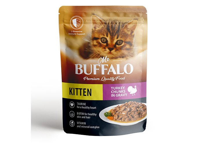 Влажный корм премиум-класса с индейкой для котят «Индейка на пару» в соусе Mr.Buffalo for kittens «Steamed turkey» in gravy изготовлен из натуральных, гипоаллергенных, легко усваиваемых ингредиентов, которые снижают риск индивидуальной непереносимости пищевых продуктов. Рецептура корма обеспечивает сбалансированное питание благодаря содержанию всех необходимых питательных веществ для здорового развития растущих котят. L-треонин в составе корма — незаменимая аминокислота, которая предотвращает отложение жиров в печени, участвует в синтезе коллагена и эластина (структурных белков, составляющих основу соединительной ткани, обеспечивающих ее прочность и эластичность), а также играет активную роль в формировании иммунитета. В будущем недостаток этой аминокислоты у взрослой кошки вызывает нарушение обмена веществ, снижение массы тела, сбои в работе печени. Биотин — один из самых важных витаминов для укрепления мышц, напрямую влияющий на правильное развитие нервной системы, укрепляет шёрстный покров, делает окрас более ярким, защищает кожу от микроповреждений и воспалений, а когти — от ломкости. Таурин — важный ингредиент для поддержания остроты зрения и здоровья сердечно-сосудистой системы кошек. Влажный корм Mr.Buffalo не содержит сахара, ГМО, сои. Паучи отлично дополнят полнорационный сухой корм Mr.Buffalo и внесут разнообразие в питание вашей кошки.