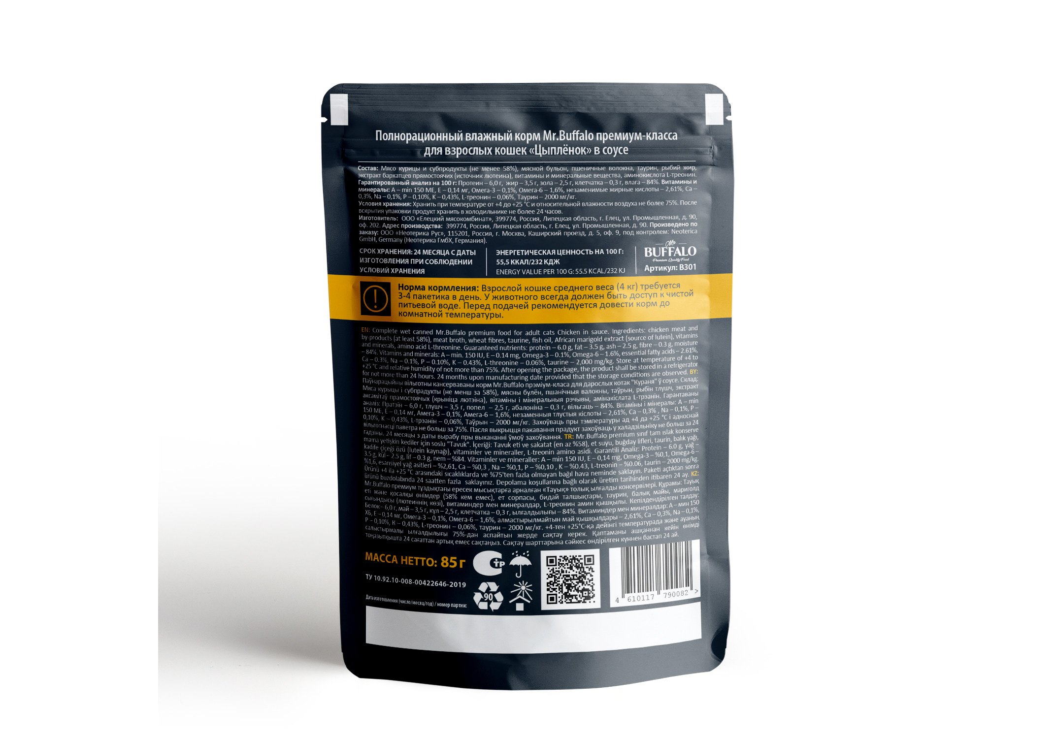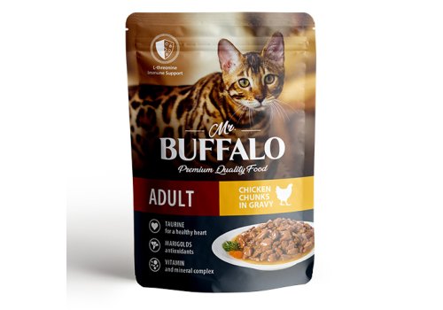 Влажный корм премиум-класса с курицей для взрослых котов и кошек «Цыпленок» в соусе Mr.Buffalo for adult cats «Chicken» in gravy изготовлен из натуральных, гипоаллергенных и легко усваиваемых ингредиентов. В оптимальном количестве содержит животные белки и жиры, питательные вещества, а также микроэлементы, необходимые для жизнедеятельности вашей кошки. Благодаря сбалансированному составу поддерживает работу желудочно-кишечного тракта, иммунитета, а также других органов и систем организма. L-треонин в составе корма — незаменимая аминокислота, которая предотвращает отложение жиров в печени, участвует в синтезе коллагена и эластина (структурных белков, составляющих основу соединительной ткани, обеспечивающих ее прочность и эластичность), а также играет активную роль в формировании иммунитета. Вместе с тем у взрослых кошек недостаток этой аминокислоты вызывает нарушение обмена веществ, снижение массы тела и сбои в работе печени. Лютеин (экстракт бархатцев прямостоячих) — полезная добавка, которая прекрасно усваивается организмом животных и благоприятно действует на зрение. Таурин в составе корма — важный ингредиент для поддержания остроты зрения и здоровья сердечно-сосудистой системы кошек. Влажный корм Mr.Buffalo не содержит сахара, ГМО, сои. Паучи отлично дополнят полнорационный сухой корм Mr.Buffalo и разнообразят питание вашей кошки!