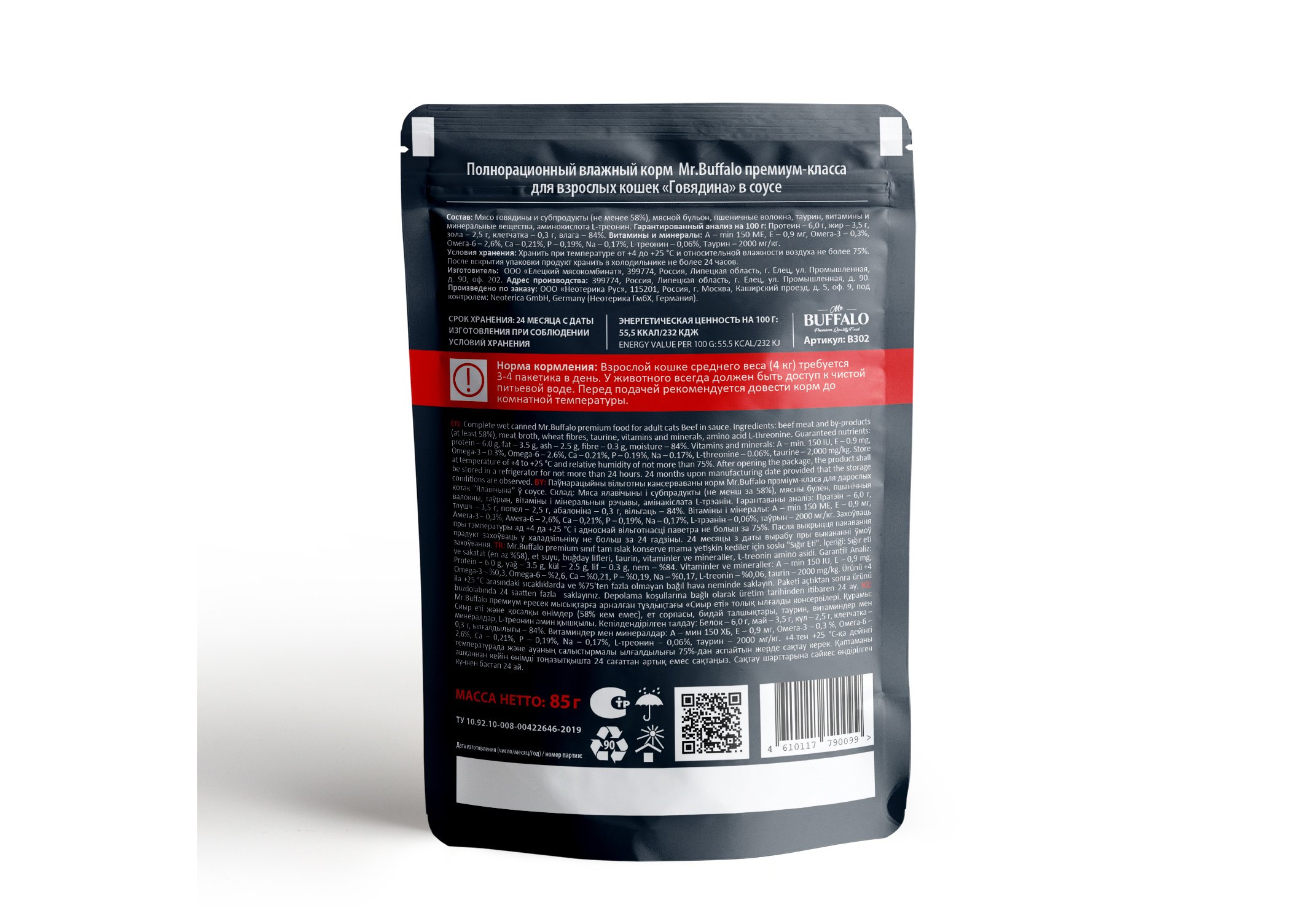 Влажный корм премиум-класса с говядиной для взрослых кошек «Говядина» в соусе Mr.Buffalo for adult cats «Beef» in gravy изготовлен из натуральных, гипоаллергенных и легко усваиваемых ингредиентов. В оптимальном количестве содержит животные белки и жиры, питательные вещества, а также микроэлементы, необходимые для жизнедеятельности вашей кошки. Благодаря сбалансированному составу поддерживает работу желудочно-кишечного тракта, иммунитета, а также других органов и систем организма. L-треонин в составе корма — незаменимая аминокислота, которая предотвращает отложение жиров в печени, участвует в синтезе коллагена и эластина (структурных белков, составляющих основу соединительной ткани, обеспечивающих ее прочность и эластичность), а также играет активную роль в формировании иммунитета. Вместе с тем у взрослых кошек недостаток этой аминокислоты вызывает нарушение обмена веществ, снижение массы тела и сбои в работе печени. Омега-3 и омега-6 в составе помогают поддерживать здоровье кожи, укрепляют иммунную систему, а также сердечно-сосудистую и мозговую деятельность. Таурин в составе корма — важный ингредиент для поддержания остроты зрения и здоровья сердечно-сосудистой системы кошек. Влажный корм Mr.Buffalo не содержит сахара, ГМО, сои. Паучи отлично дополнят полнорационный сухой корм Мr.Buffalo и внесут разнообразие в питание вашей кошки.