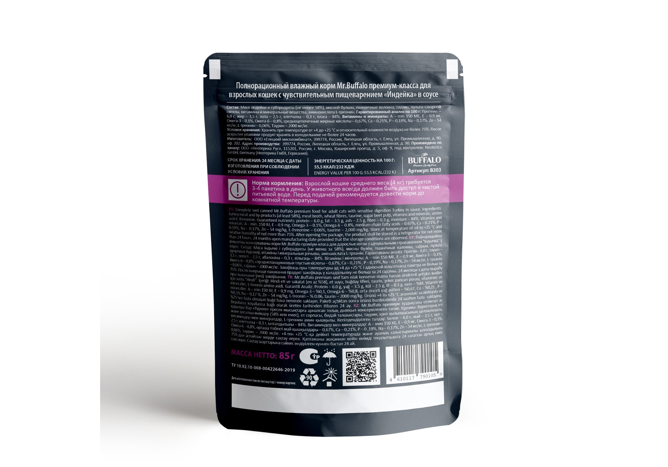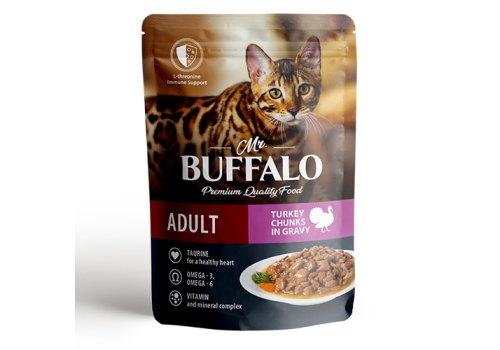 Влажный корм премиум-класса с индейкой для взрослых кошек с чувствительным пищеварением «Индейка» в соусе Mr.Buffalo for adult cats with sensitive digestion «Turkey» in gravy изготовлен из натуральных, гипоаллергенных и легко усваиваемых ингредиентов. В оптимальном количестве содержит животные белки и жиры, питательные вещества, а также микроэлементы, необходимые для жизнедеятельности вашей кошки. Благодаря сбалансированному составу поддерживает работу желудочно-кишечного тракта, иммунитета, а также других органов и систем организма. L-треонин в составе корма — незаменимая аминокислота, которая предотвращает отложение жиров в печени, участвует в синтезе коллагена и эластина (структурных белков, составляющих основу соединительной ткани, обеспечивающих ее прочность и эластичность), а также играет активную роль в формировании иммунитета. Вместе с тем у взрослых кошек недостаток этой аминокислоты вызывает нарушение обмена веществ, снижение массы тела и сбои в работе печени. Таурин в составе корма — важный ингредиент для поддержания остроты зрения и здоровья сердечно-сосудистой системы кошек. Влажный корм Mr.Buffalo не содержит сахара, ГМО, сои. Паучи отлично дополнят полнорационный сухой корм Mr.Buffalo и внесут разнообразие в питание вашей кошки.