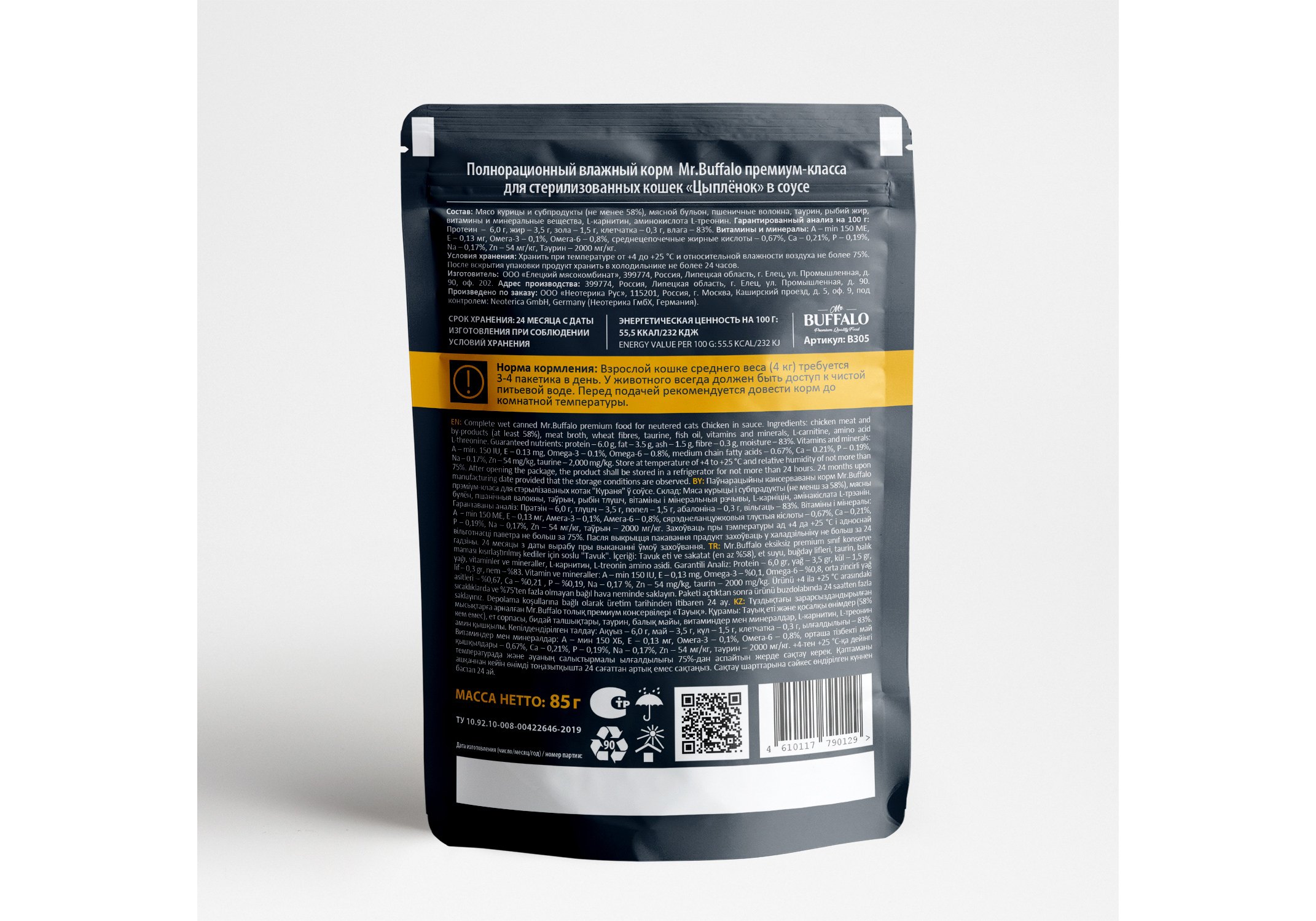 Влажный корм премиум-класса с цыпленком для взрослых стерилизованных котов и кошек «Цыпленок» в соусе Mr.Buffalo for sterilized cats «Chicken» in gravy изготовлен из натуральных, гипоаллергенных и легко усваиваемых ингредиентов. В оптимальном количестве содержит животные белки и жиры, питательные вещества, а также микроэлементы, необходимые для жизнедеятельности вашей кошки. Благодаря сбалансированному составу поддерживает работу желудочно-кишечного тракта, иммунитета, а также других органов и систем организма. Рацион разработан на основе исследований в области питания домашних животных, учитывающих особенности организма стерилизованной кошки, изготовлен специально для того, чтобы помочь животному чувствовать себя здоровым и активным. L-треонин в составе корма — незаменимая аминокислота, которая предотвращает отложение жиров в печени, участвует в синтезе коллагена и эластина (структурных белков, составляющих основу соединительной ткани, обеспечивающих ее прочность и эластичность), а также играет активную роль в формировании иммунитета. Вместе с тем у взрослых кошек недостаток этой аминокислоты вызывает нарушение обмена веществ, снижение массы тела и сбои в работе печени. L-карнитин в составе рациона является важнейшим участником метаболизма жиров, доставляя в клетки жирные кислоты, которые в ходе дальнейшего процесса превращаются в энергию. Таурин — важный ингредиент для поддержания остроты зрения и здоровья сердечно-сосудистой системы кошек. Влажный корм Mr.Buffalo не содержит сахара, ГМО, сои. Паучи отлично дополнят полнорационный сухой корм Mr.Buffalo и внесут разнообразие в питание вашей кошки.