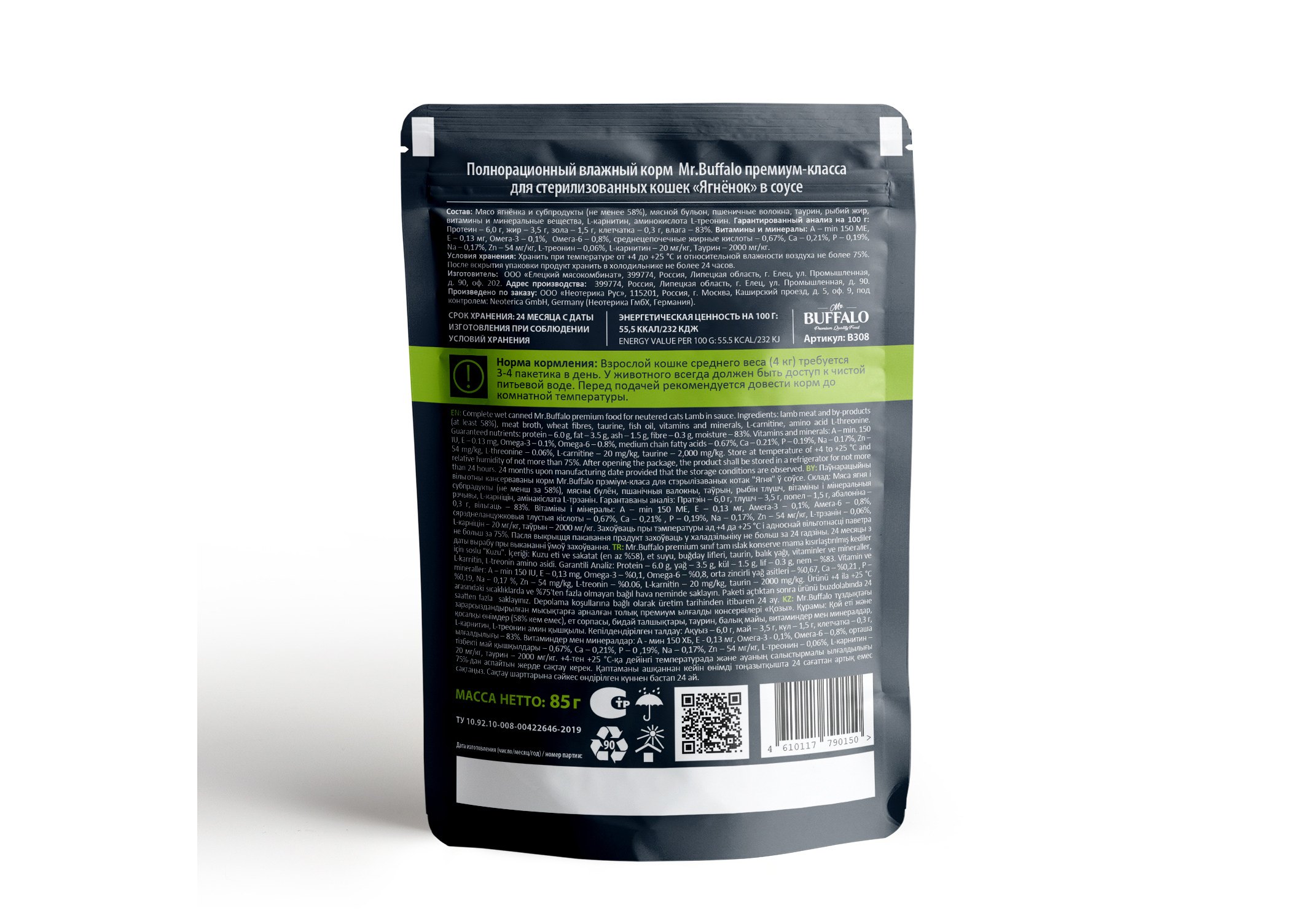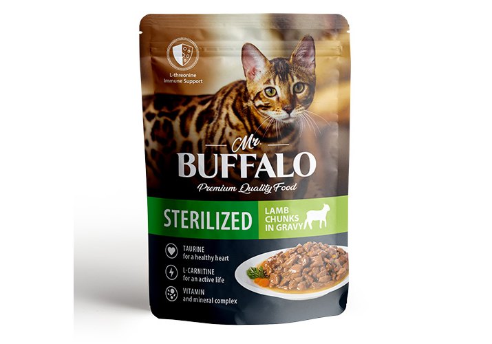 Влажный корм премиум-класса с ягненком для взрослых стерилизованных котов и кошек "Ягненок" в соусе Mr.Buffalo for sterilized cats "Lamb" in gravy изготовлен из натуральных, гипоаллергенных и легко усваиваемых ингредиентов. В оптимальном количестве содержит животные белки и жиры, питательные вещества, а также микроэлементы, необходимые для жизнедеятельности вашей кошки. Благодаря сбалансированному составу поддерживает работу желудочно-кишечного тракта, иммунитета, а также других органов и систем организма. Рацион разработан на основе исследований в области питания домашних животных, учитывающий особенности организма стерилизованной кошки, изготовлен специально для того, чтобы помочь животному чувствовать себя здоровым и активным. L-треонин в составе корма – незаменимая аминокислота, которая предотвращает отложение жиров в печени, участвует в синтезе коллагена и эластина (структурных белков, составляющих основу соединительной ткани, обеспечивающих её прочность и эластичность), а также принимает активную роль в формировании иммунитета. Вместе с тем, у взрослых кошек недостаток этой аминокислоты вызывает нарушение обмена веществ, снижение массы тела и сбои в работе печени. L-карнитин в составе рациона – является важнейшим участником метаболизма жиров, доставляя в клетки жирные кислоты, которые в ходе дальнейшего процесса превращаются в энергию. Таурин – важный ингредиент для поддержания остроты зрения и здоровья сердечно-сосудистой системы кошек. Влажный корм Mr.Buffalo не содержит сахар, ГМО, Сою. Паучи отлично дополнят полнорационный сухой корм Mr.Buffalo и внесут разнообразие в питание Вашей кошки.