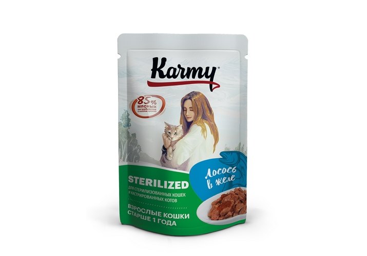 Karmy Sterilized Влажный корм Паучи Карми для Стерилизованных кошек Лосось в желе (цена за упаковку) 80г х 12шт